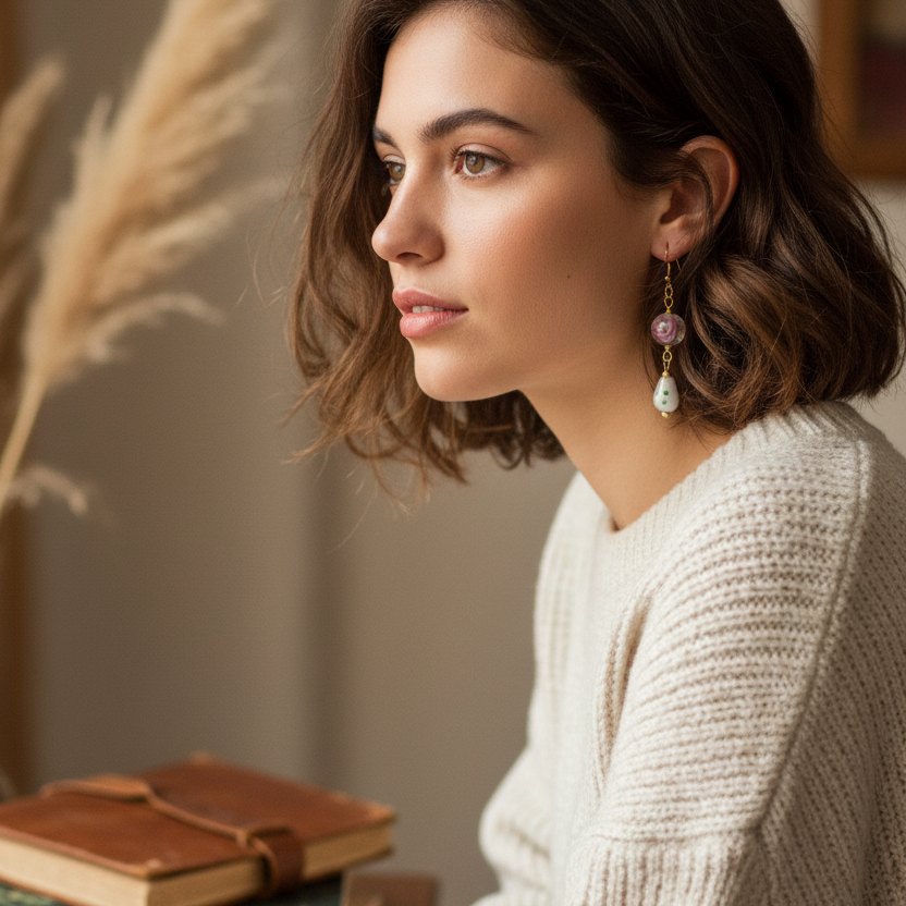 These earrings combine artistic design with wearable elegance, giving your outfits a unique, eye-catching charm. The warm tones of gold plating paired with delicate glass roses make them a perfect choice for gifting or adding a statement piece to your own jewellery rotation.